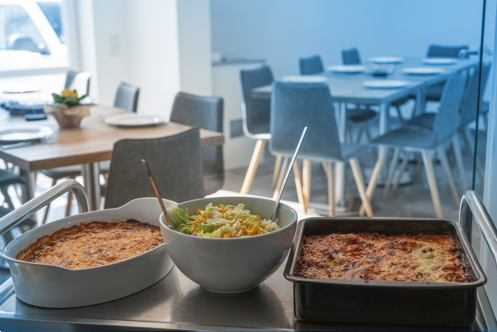 Gekocht von unserer eigenen Köchin, serviert in unserer Kantine. Unsere kleine Kantine ist sehr gemütlich. Wir treffen uns dort jeden Tag zum Mittagessen.