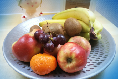 Vitamine sind wichtig, deshalb gibt es jeden Tag eine Auswahl an Früchten, an der sich jede:r bedienen kann.